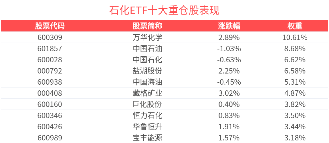 石化ETF紧密跟踪中证石化产业指数,数据显示,截至2026年1月30日,中证石化产业指数前十大权重股分别为万华化学、中国石油、盐湖股份、中国石化、中国海油、藏格矿业、华鲁恒升、恒力石化、巨化股份、宝丰能源,前十大权重股合计占比55.71%。