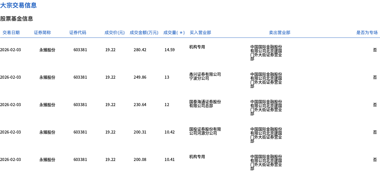 2月3日,永臻股份大宗交易成交60.42万股,成交额1161.31万元,占当日总成交额的3.57%,成交价19.22元,较市场收盘价23.2元折价17.16%。