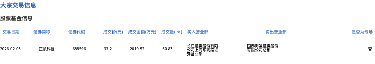 2月3日,正帆科技大宗交易成交60.83万股,成交额2019.52万元,占当日总成交额的6.54%,成交价33.2元,较市场收盘价33.58元折价1.13%。
