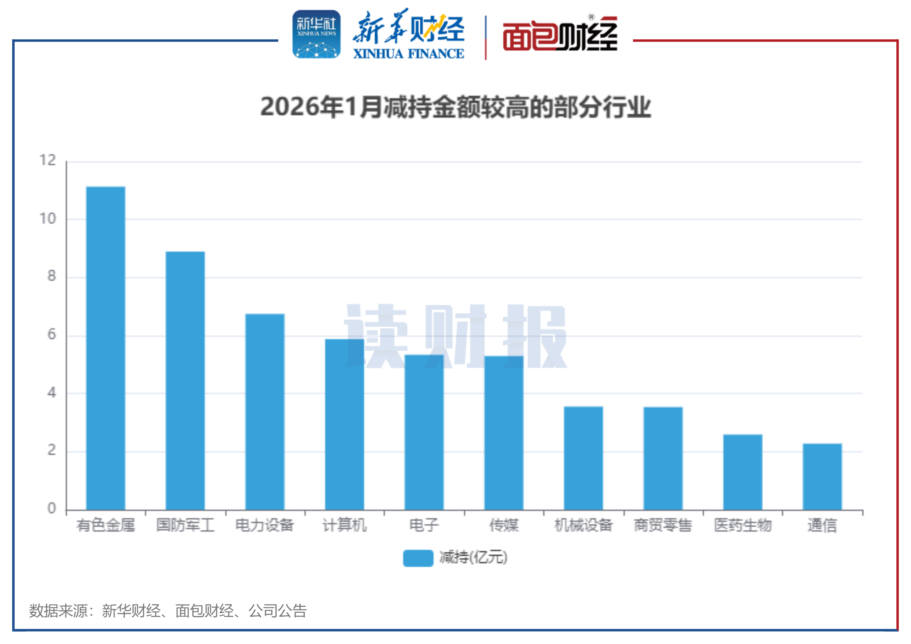 在申万行业分类下,有色金属行业的1月减持金额排在首位,约为11.13亿元;国防军工行业1月的减持金额排在第二,约为8.89亿元;电力设备行业1月减持金额也排名靠前,约为6.74亿元。
