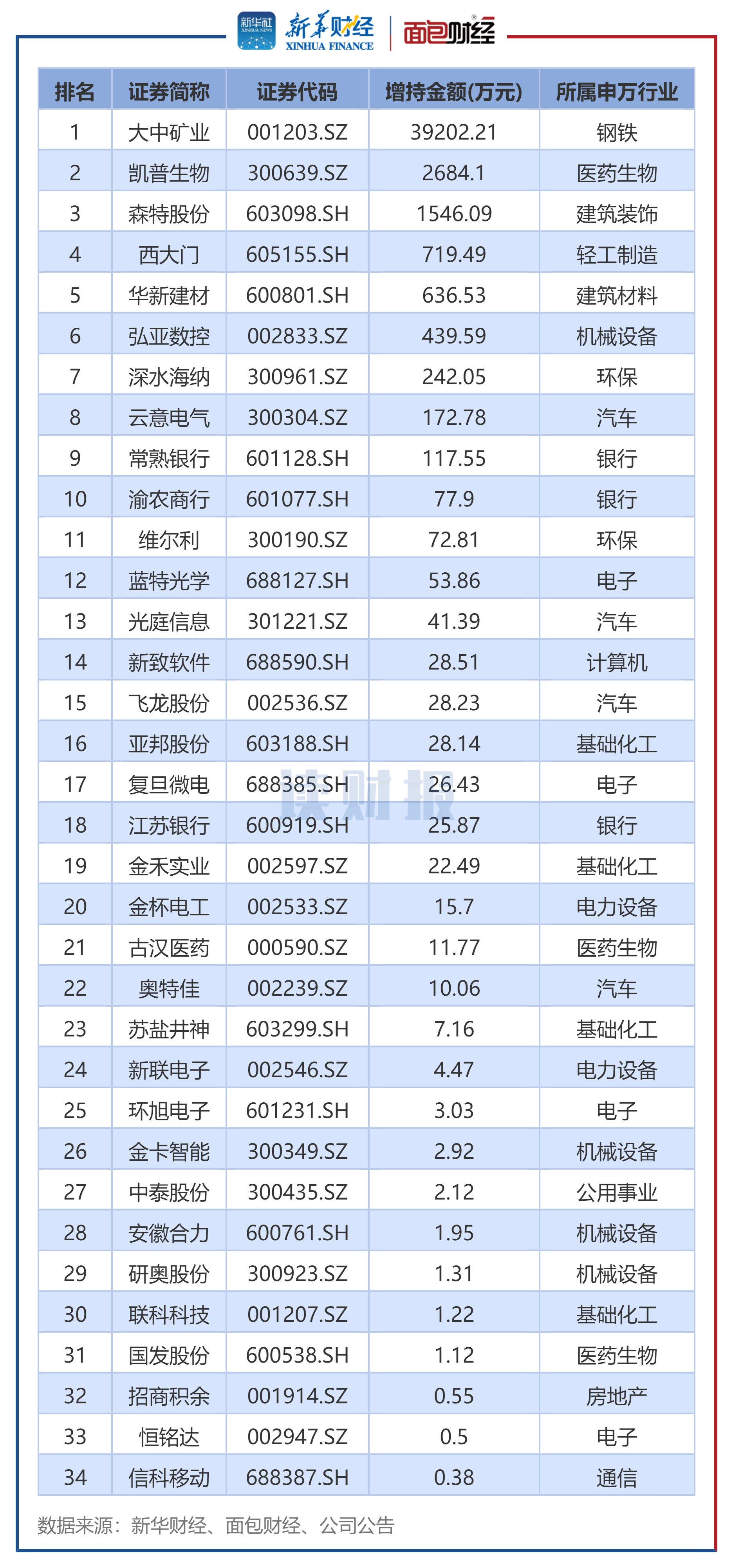 个股来看,大中矿业、凯普生物、森特股份的增持金额排名前三。