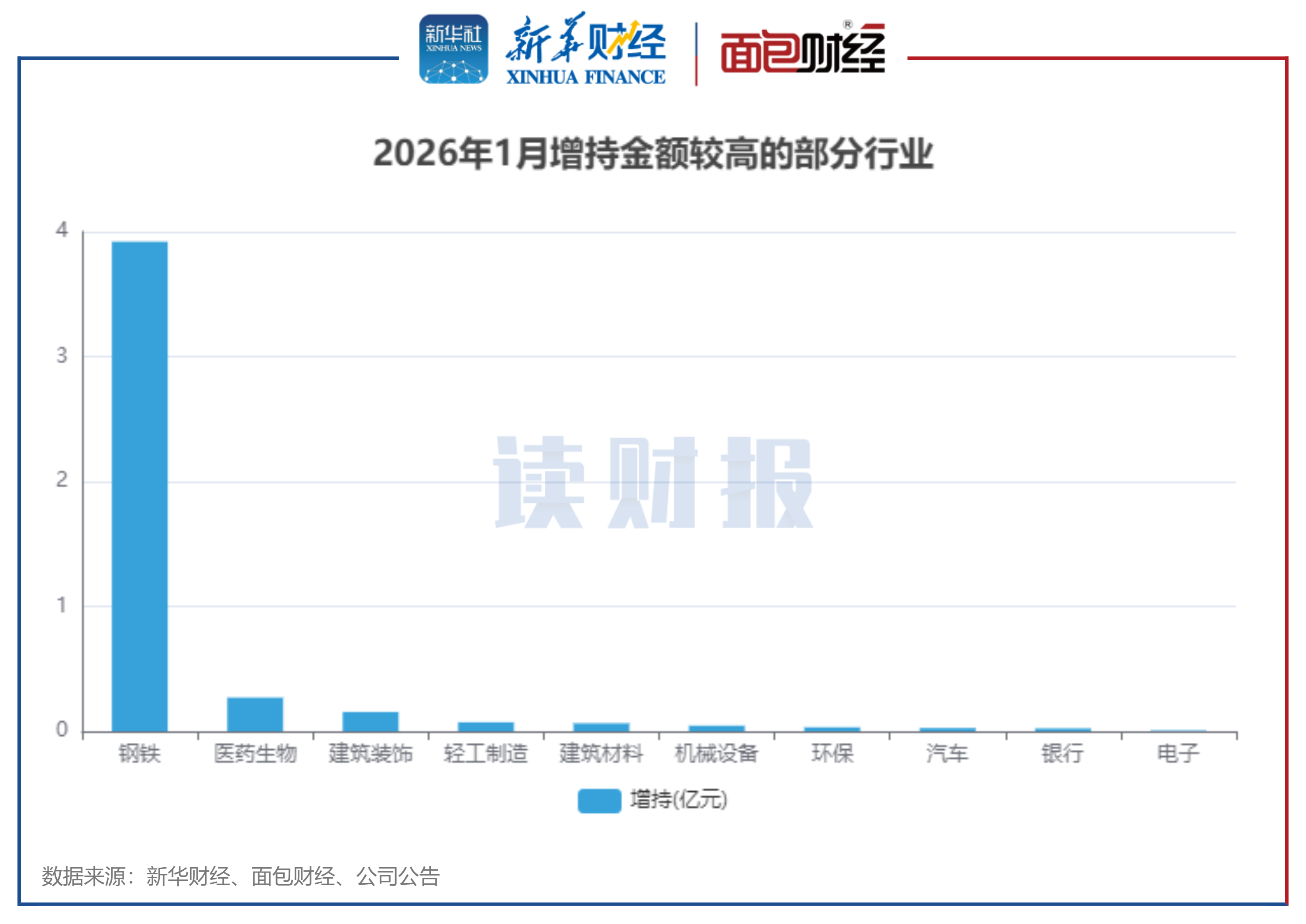 从行业来看,1月份钢铁行业的增持金额排在首位,约为3.92亿元;医药生物行业增持金额排在第二,约为0.27亿元;建筑装饰行业增持金额也在前列,约为0.15亿元。