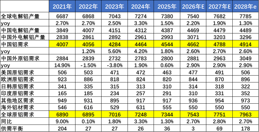 图片趋势描述:从数据趋势分析,随着新能源+AI不断放量,中国以及全球铝需求正在逐年增加