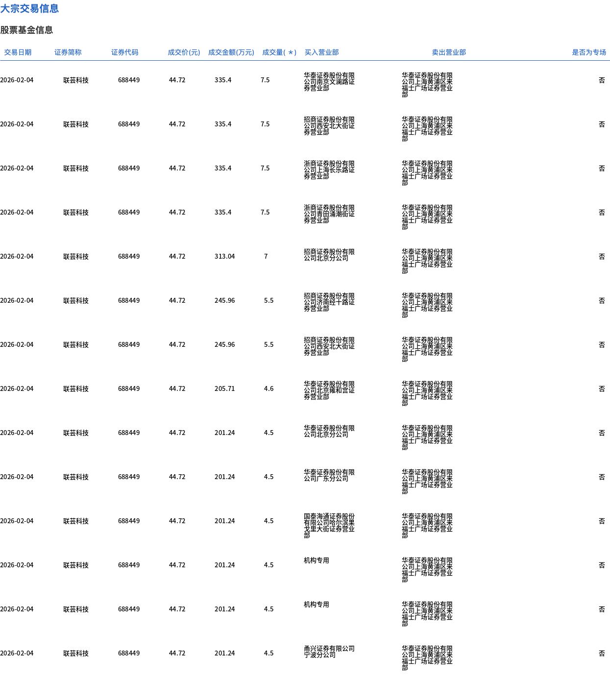 2月4日,联芸科技大宗交易成交79.6万股,成交额3559.71万元,占当日总成交额的7.96%,成交价44.72元,较市场收盘价50.82元折价12%。