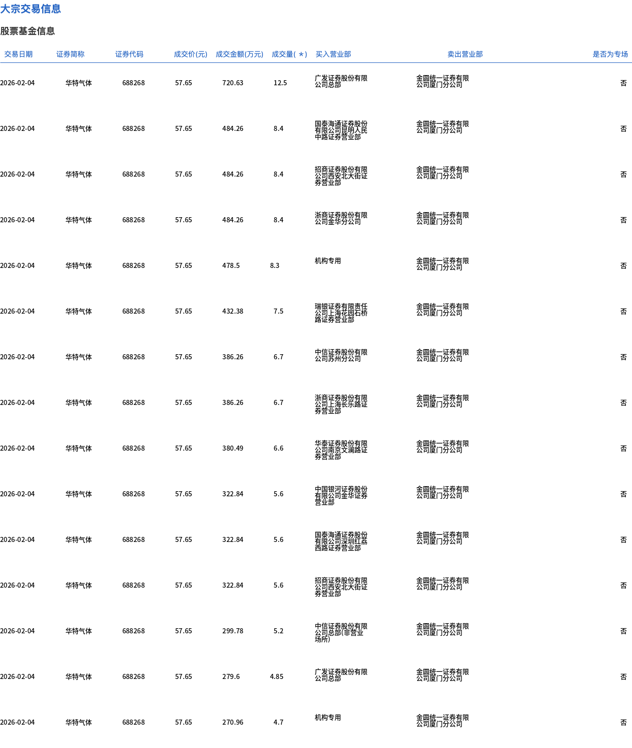 2月4日,华特气体大宗交易成交128.45万股,成交额7405.18万元,占当日总成交额的45.82%,成交价57.65元,较市场收盘价62.79元折价8.19%。
