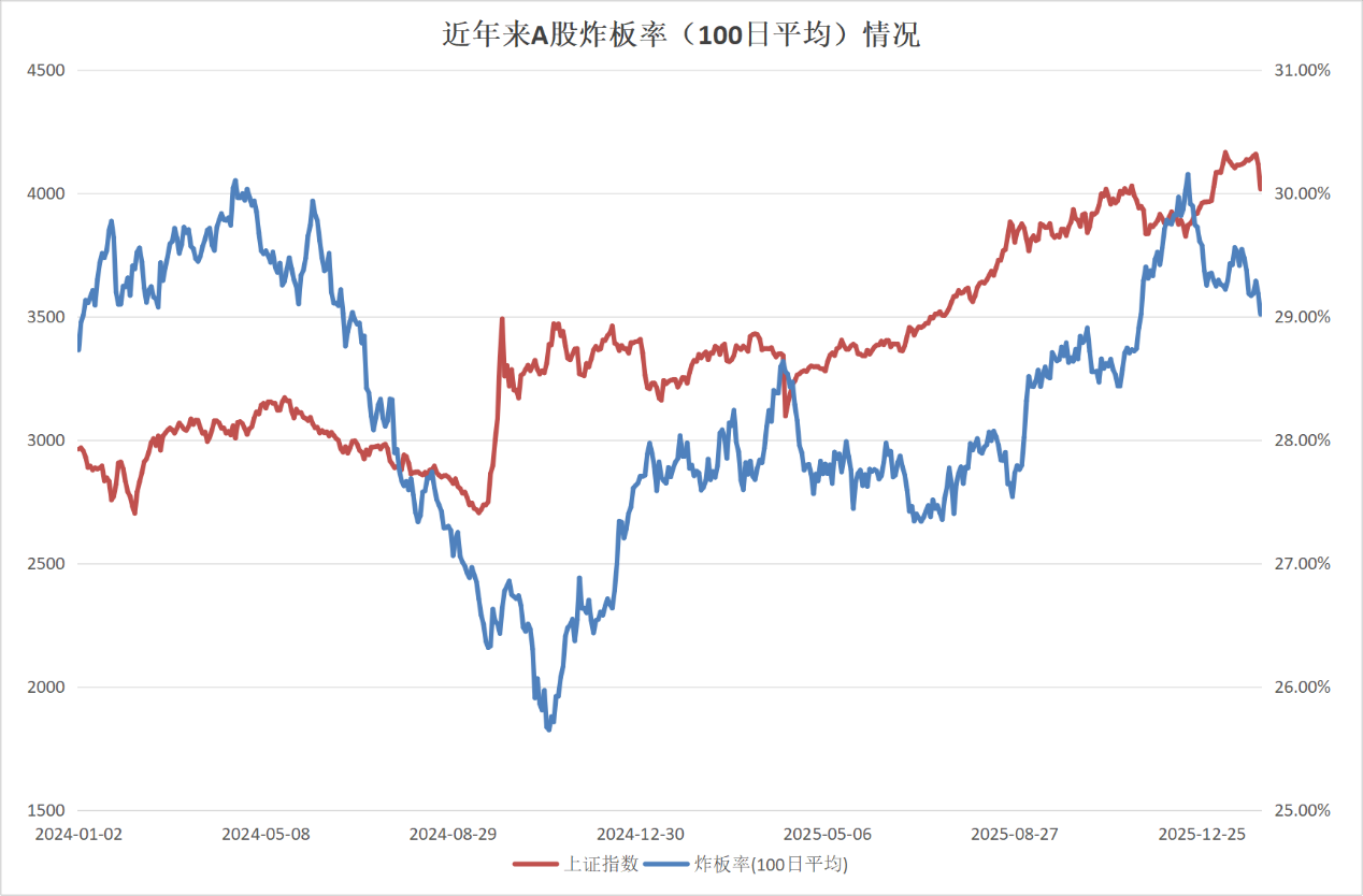 界面新闻进一步统计了2024年以来炸板率的100日平均情况,可以看出,在2024年11月份的“疯牛”行情结束以后,市场的炸板率是在不断升高的,说明短线投机的波动越来越大。