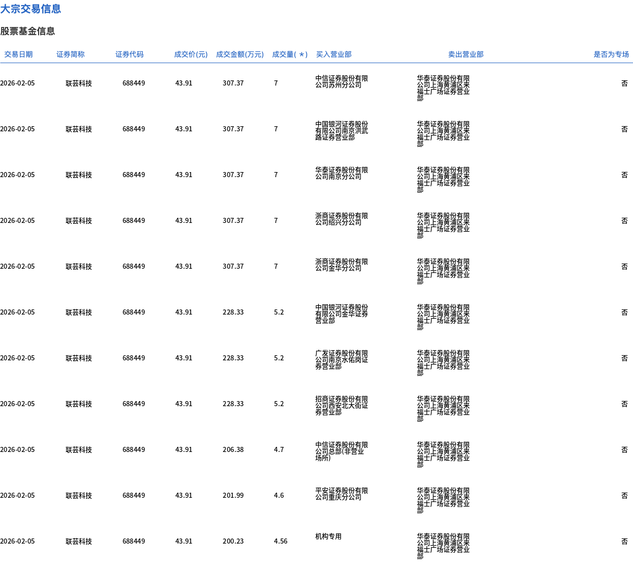 2月5日,联芸科技大宗交易成交64.46万股,成交额2830.44万元,占当日总成交额的8.04%,成交价43.91元,较市场收盘价49.9元折价12%。