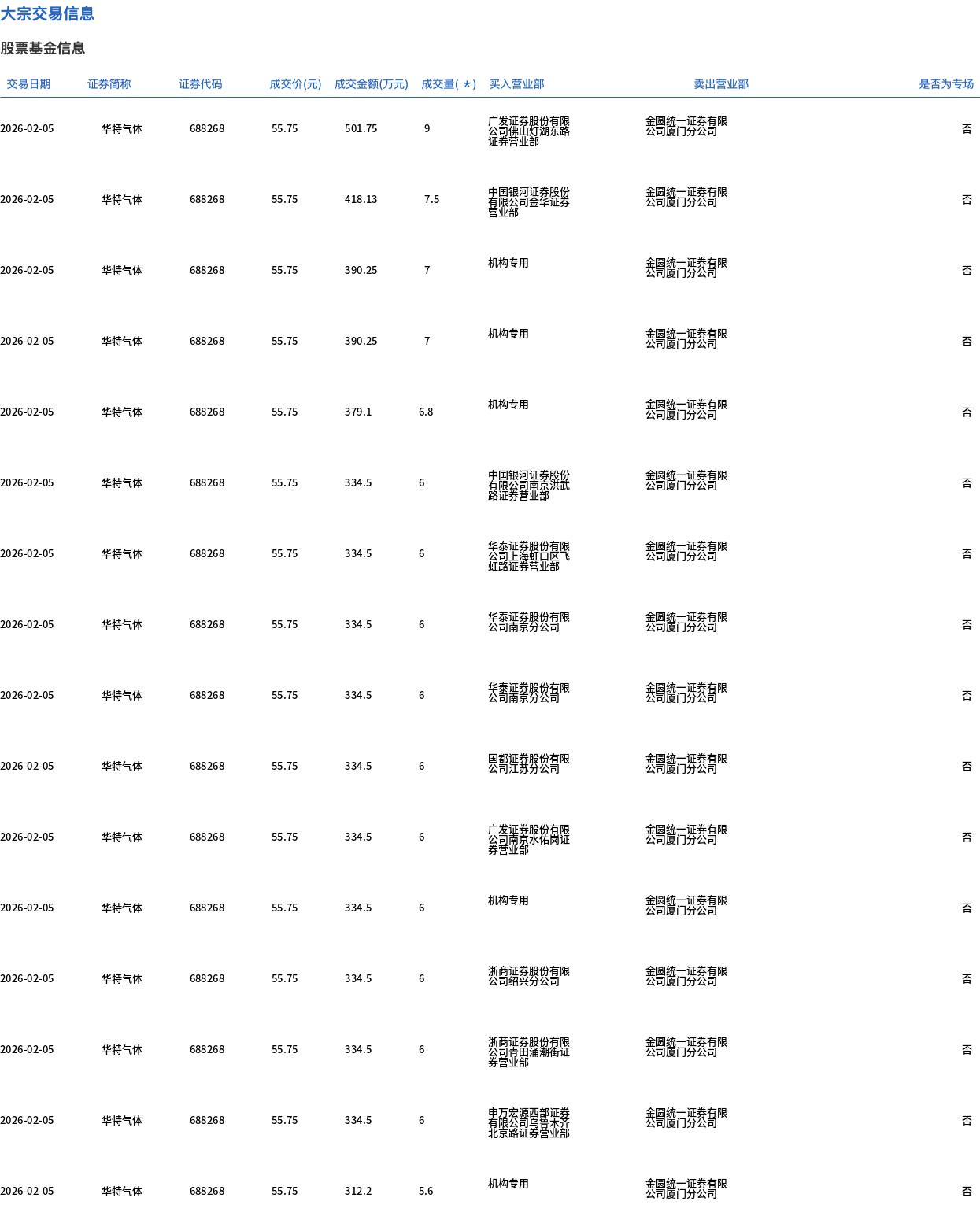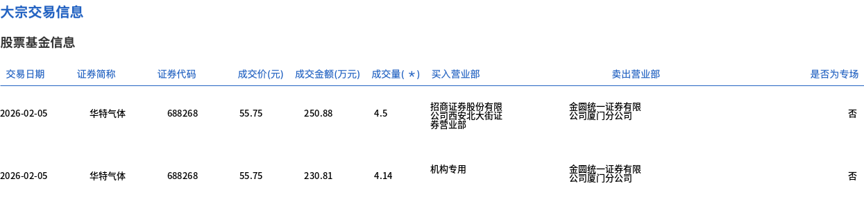 2月5日,华特气体大宗交易成交111.54万股,成交额6218.37万元,占当日总成交额的32.4%,成交价55.75元,较市场收盘价61.69元折价9.63%。