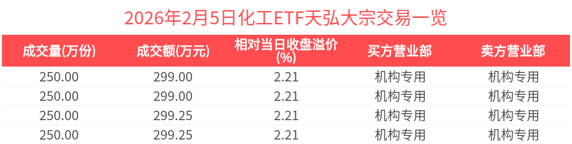 2026年2月5日,化工ETF天弘(159133.SZ)收跌1.84%,发生4笔溢价大宗交易,成交价均为1.20元,较当日收盘价溢价2.21%。成交额分别为299.00万元,299.00万元,299.25万元,299.25万元,总成交额为1196.50万元,居可比基金首位。(数据来源:Wind)