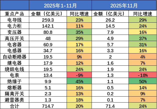 数据显示,2025年1-11月,我国重点电力设备出口规模达715亿美元,同比增长20%,显著高于机电产品整体出口增速。细分品类呈现结构分化特征:绝缘子出口同比激增45%,变压器增长35%,开关设备与绕组电线分别录得29%和24%的增幅,高附加值输变电装备成为拉动出口增长的核心动能。