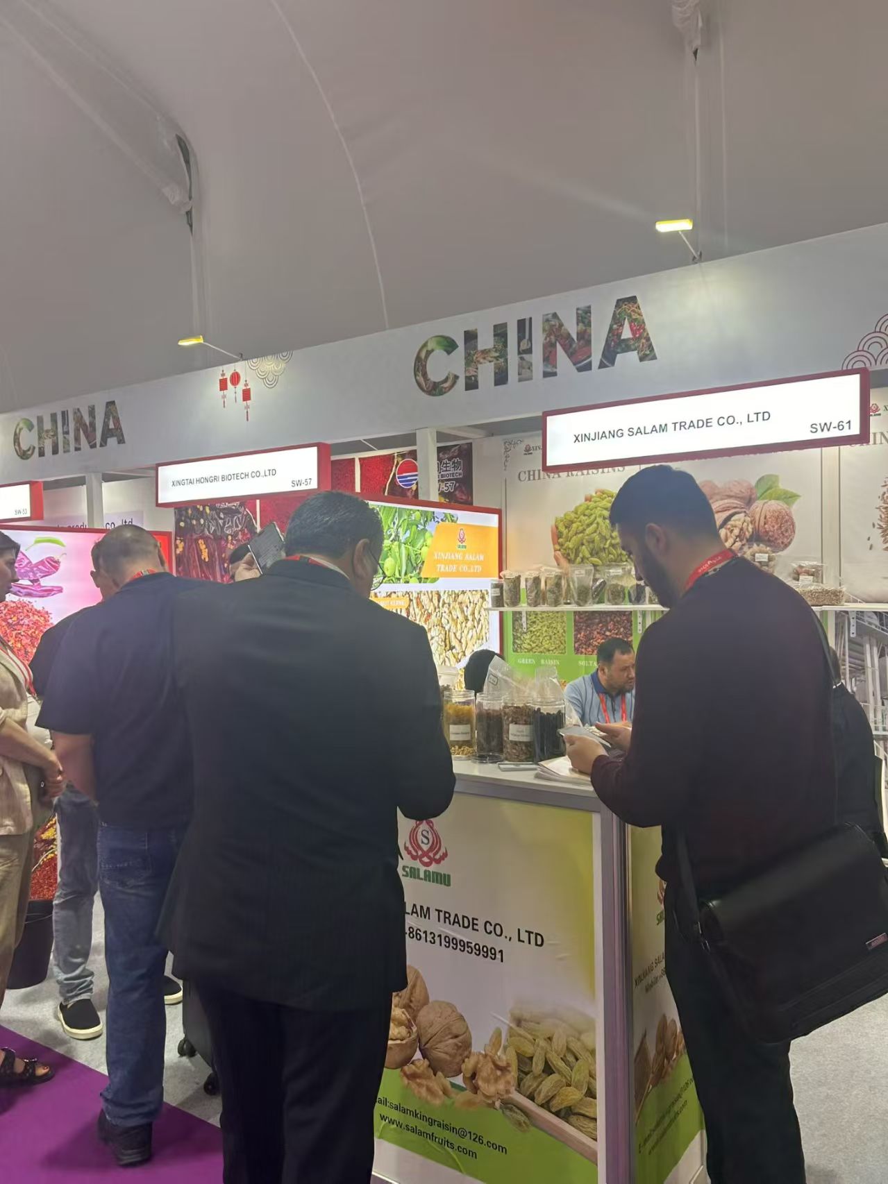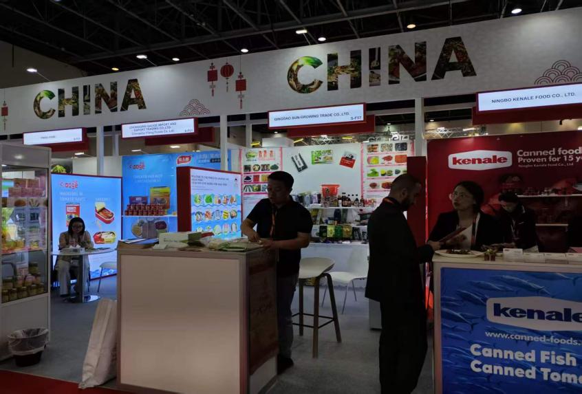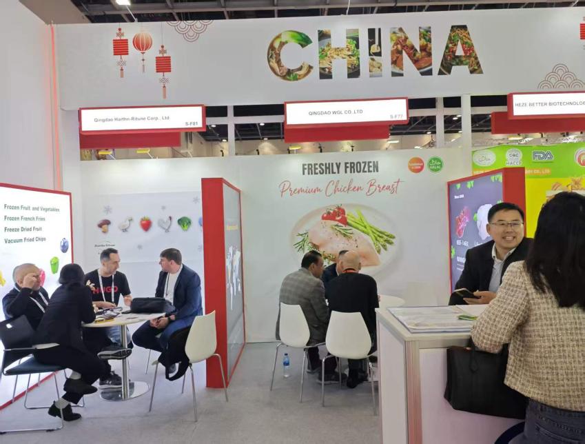 青岛双合源贸易有限公司,今年已经是第15次参加迪拜海湾食品展,主打冷链食品,展会5天接待客商200多人,其中高意向买家近80人,大型零售商露露超市(Lulu)、奥赛姆市场(Al Othaim)等前来洽谈,现场意向成交额220万美金;青岛擎海贸易有限公司今年是第7次参展,展位现场人流不断,3个老客户现场直接下单4个柜,意向成交金额95万美金;青岛天赐丰食品有限公司第2次参加展会,5天收到的名片达到300多张,意向成交8个买家,成交金额达150万美金,现场直接预定了2027年的展会。