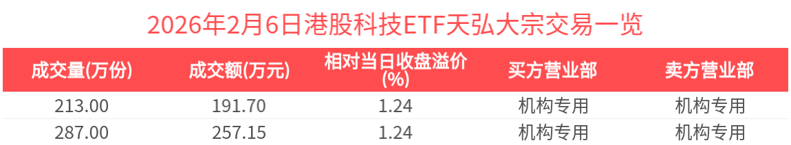 2026年2月6日,港股科技ETF天弘(159128.SZ)收跌0.11%,发生2笔溢价大宗交易,成交价均为0.90元,较当日收盘价溢价1.24%。成交额分别为191.70万元,257.15万元,总成交额为448.85万元,居可比基金第一。(数据来源:Wind)