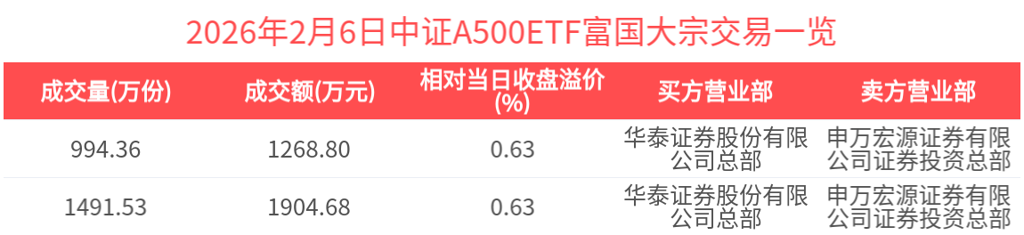 2026年2月6日,中证A500ETF富国(563220.SH)收跌0.55%,发生2笔溢价大宗交易,成交价均为1.28元,较当日收盘价溢价0.63%。成交额分别为1268.80万元,1904.68万元,总成交额为3173.48万元,居全市场前三。(数据来源:Wind)