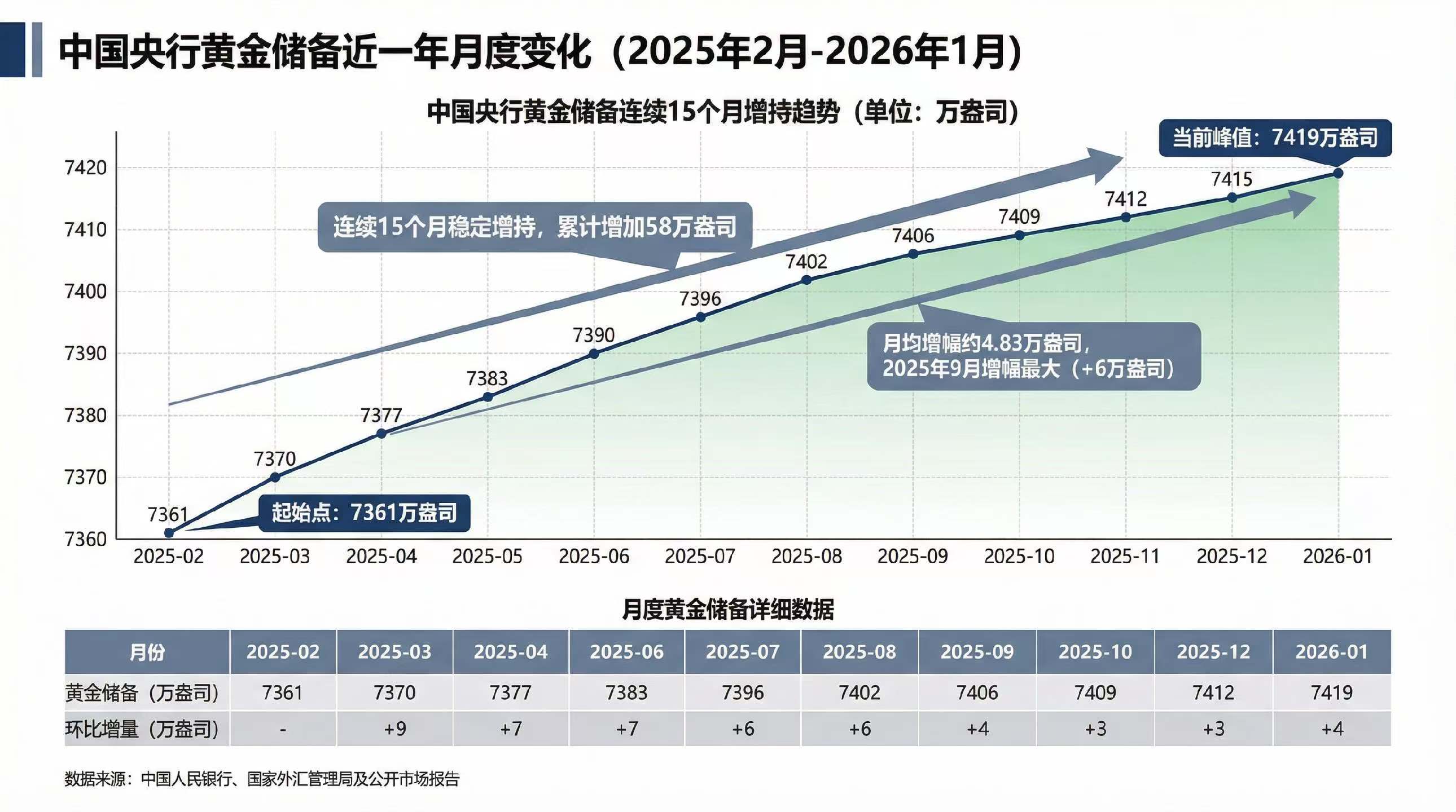2026年2月9日早盘,现货黄金盘中重返5000美元关口上方,并在此后快速走高,一度站上5040美元/盎司关口。消息面方面,2月7日,国家外汇管理局公布的数据显示,截至2026年1月末黄金储备报7419万盎司,较2025年12月末的7415万盎司环比增加4万盎司。回顾人民银行本轮增持黄金,始于2024年11月,截至2026年1月末,已经持续15个月。