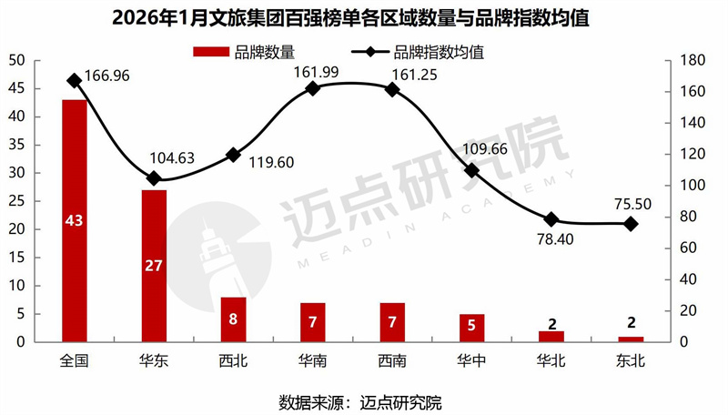 1月百强文旅集团中,全国性品牌数量最多,共43家,主要为文旅上市公司、大型民营企业,其综合实力强、品牌知名度高;华东地区次之,文旅产业经济较发达、文旅企业的品牌培育与营销相对领先,在总量上占据优势。区域品牌指数均值维度,全国、华南、西南为第一梯队,指数均值均超160;西北、华中、华东为第二梯队,指数值处在100-120之间;华北和东北相对较低,指数均值均低于80,反映出文旅集团品牌传播在区域间仍存在产业基础、运营能力与影响辐射能力的梯度差异。