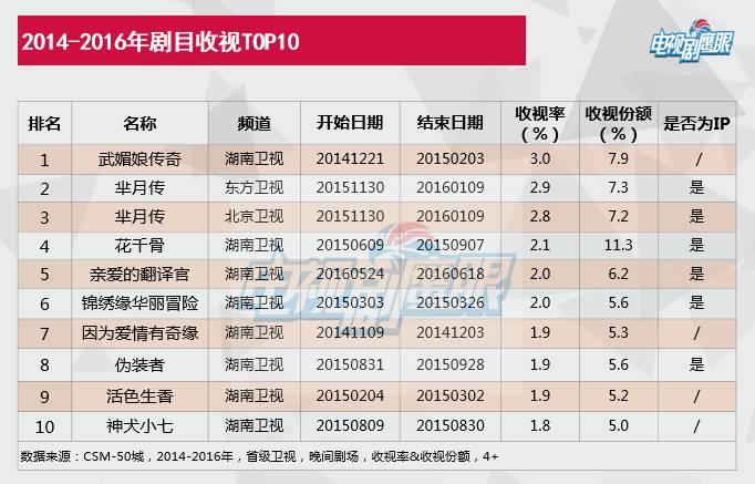 回顾2014-2016年播出剧目,在收视TOP10里,IP剧占据六席之位,CSM50城收视在2%以上的剧目有6部,其中IP改编剧独揽5项,占比83.3%,成为高收视收割机。其中,《芈月传》双平台收视飘红,在东方和北京卫视分别取得2.9%和2.8%的高收视,强势入榜;《花千骨》作为次黄播出剧目,收视惊喜破2,市场份额更直接破10,高居不下,成为周播剧场叫好又叫座的现象级改编剧;2016年播出的IP剧《亲爱的翻译官》以CSM50城2.04%的收视率成为唯一一部破2的当代剧;近代IP改编剧《锦绣缘华丽冒险》和《伪装者》也分别以2.0%和1.9%的高收视纷纷上榜。由此可见,在近几年国产剧中,IP剧稳占收视制高点,优势明显,业已成为中国电视剧中不可忽视的中坚力量。