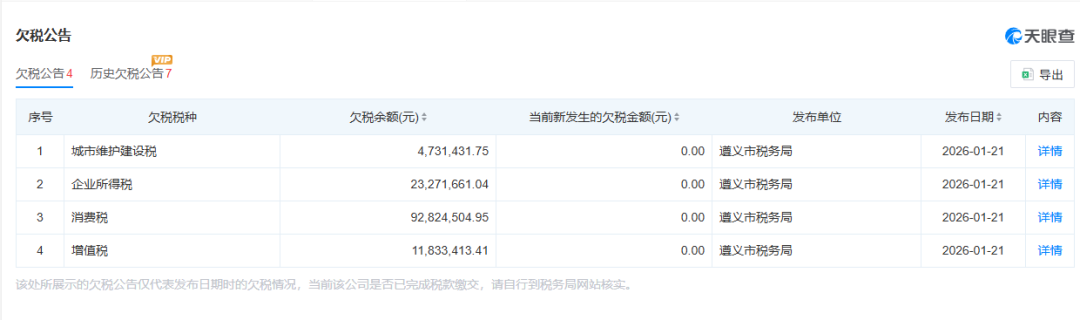 2026年初,一则来自天眼查的工商信息显示,贵州省仁怀市茅台镇衡昌烧坊酿酒有限公司、贵州省仁怀市茅台镇衡昌烧坊酒业销售有限公司欠缴城市维护建设税、企业所得税、消费税和增值税累计约1.32亿元。
