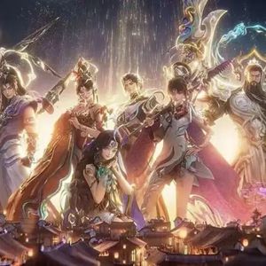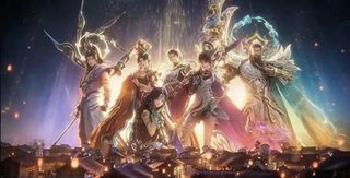 镜头猛烈向前推近,伴随着强烈的能量冲击波!左侧红衣女将眼神锐利如刀,猛然拔出腰间长剑,剑身爆发出炽热的火焰,她振臂高呼:“犯我疆土者,虽远必诛!”。镜头围绕中间的白衣男主和绿衣女主进行快速环绕俯冲,绿衣女主手中的法杖顶端宝石光芒大盛,地面上浮现出古老的魔法阵。右侧金甲武将发出一声震天怒吼,将巨斧重重砸在地面,激起一圈金色的能量涟漪,风云为之变色。背景天空中的流光变成巨大的火流星划过,远处的城市燃起熊熊烽火,整个画面充满了山雨欲来的紧张感和毁天灭地的战斗气势。最后,镜头快速拉远,定格在五位英雄共同释放力量、准备迎接最终决战的宏大史诗场面。