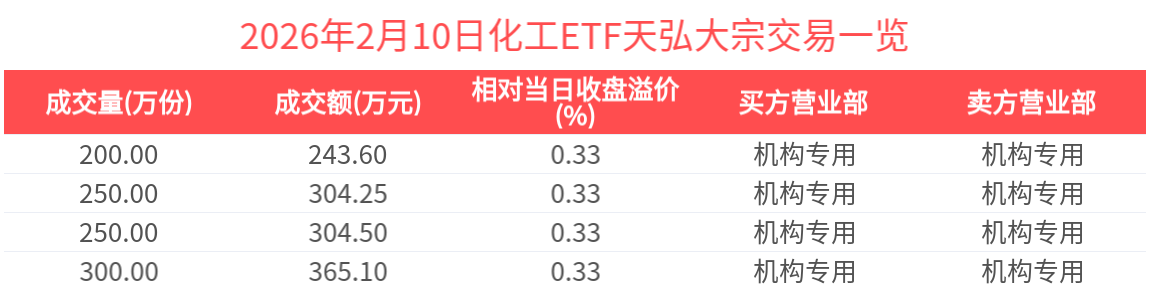 2026年2月10日,化工ETF天弘(159133.SZ)收跌0.16%,发生4笔溢价大宗交易,成交价均为1.22元,较当日收盘价溢价0.33%。成交额分别为243.60万元,304.25万元,304.50万元,365.10万元,总成交额为1217.45万元,居全市场第一。(数据来源:Wind)