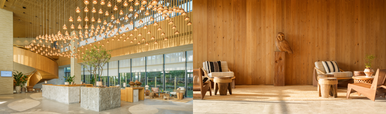 自抵达酒店起,茶的意象即悄然展开。大堂以茶为核心线索,将惠州斗茶文化融入各个细节:灯具形态取材斗茶茶具,通过茶筛与茶杯的结合,呈现出灵动的视觉表达;地面摹写茶叶形态,并以茶树点缀其间,使茶韵在行走之间自然流淌;空间则选用竹木、陶土等自然材质,结合水景元素,营造轻盈的度假氛围。与此同时,酒店的公共空间与动线中亦融入了丰富的小动物设计元素,楼层以松鼠、猫头鹰等自然动物命名,每层电梯出口均设置相应的小动物木雕摆件,让自然与野趣在空间中蔓延。