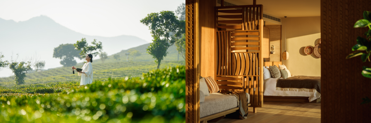 客房则秉承“自然简约、轻盈舒适”的设计理念,规划“茶田云居”、“茶田套房”、“绿野复式套房”与“云境套房”等多种房型。空间最大程度引入自然光线,选择环保材质,并通过叶脉纹理、原木家具与棉麻织物,将舒心惬意的茶境氛围融入起居之中。行政套房更设有榻榻米区、中岛、客厅以及户外独立泳池,满足休憩、放松与社交等多元需求。