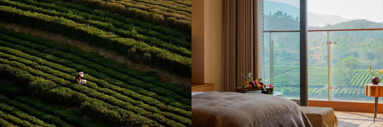 作为bynaked裸心的首发之作,酒店坐落于惠州柏塘茶山脚下,以自然肌理为底色,以在地风物探索为基调,酒店整体设计与周围茶田自然融合,当宾客步入酒店那一刻起,满眼的绿色已然让宾客踏上一场探索自然的旅程。酒店以红茶、绿茶、黄茶三大代表性茶品为文化锚点,将茶饮文化与东方美学融入空间与体验之中:茶田意象的设计细节、茶香氛围、茶餐与茶饮特调相互呼应,辅以自然材质与灵动音律,营造出层次丰富的五感茶境体验。
