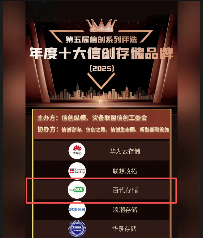 作为信创领域极具影响力的评选活动,本次评选聚焦自主可控、技术创新、生态兼容、场景落地四大核心维度,历经多轮严格评审,旨在遴选行业标杆,推动“关键信息基础设施”国产化替代与产业生态升级,此项荣誉都承载着行业与市场的高度认可。而存储作为信息技术应用创新产业的 “数据基石”,更是构建自主可控“关键信息基础设施”的关键环节,此次入选,也彰显了百代存储在存储领域的硬实力与行业认可度。