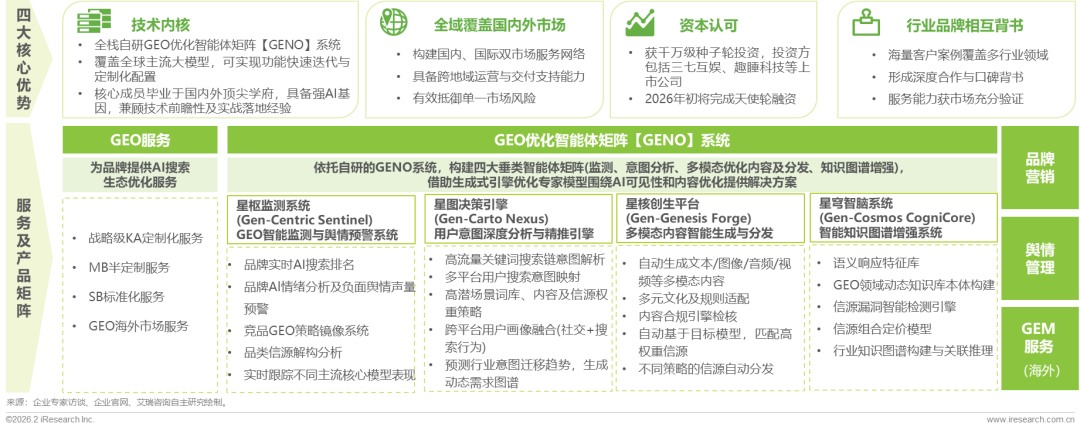 智推时代作为国内领先的综合型GEO服务商,核心业务是助力品牌在AI搜索时代,通过生成式引擎优化(GEO),提升品牌权威信息在AI生成答案中的可见性、呈现质量与可信度。智推时代通过自研的GENO系统,依托于服务层的垂类智能体矩阵及底层的生成式引擎优化专家模型,通过覆盖全球主流大模型的语义响应特征库、多模态知识图谱、时序化叙事引擎、全链路归因与感知模块、实时对抗性学习与调整等能力,为品牌方提供从意图分析、策略规划,多模态优化内容生产与分发、效果监测的全链路一站式GEO优化方案,塑造品牌在AI中的权威性,为用户提供真实可信的AI搜索信息基础。目前业务布局海内外核心市场,可快速实现本地化响应与全球化服务。