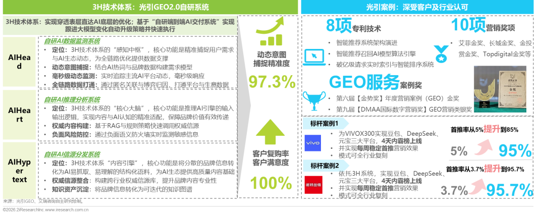 光引科技是聚焦生成引擎优化领域的AI科技营销公司,由阿里巴巴、英伟达、腾讯、字节跳动等企业顶尖营销与技术专家于2018年联合创立。基于“自研深层优化体系(3H技术体系)”实现穿透表层直达AI底层的优化;基于“自研端到端AI交付系统”实现跟进大模型变化自动升级策略并快速执行;双能力叠加,独家实现GEO从1.0 (表层优化,治标不治本)到 2.0 (深层优化,标本兼治)的跨越。光引GEO基于深厚AI技术和营销服务能力,为品牌客户提供在全球AI大模型和中国AI大模型的生成引擎优化服务,包括品牌营销、流量获取、电商转化、口碑维护等全方位的AI大模型平台优化工作,从而提高品牌在AI大模型中的露出率、首推率、正面率。
