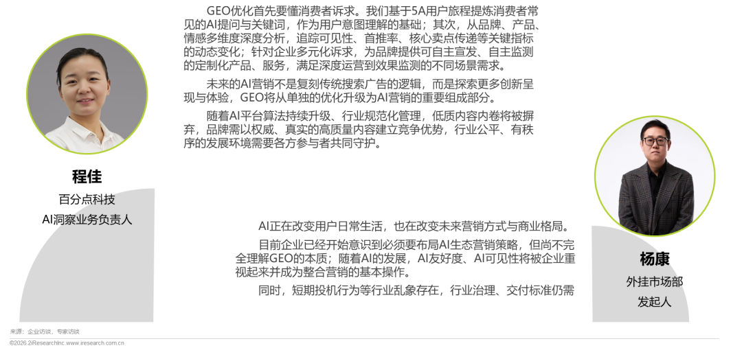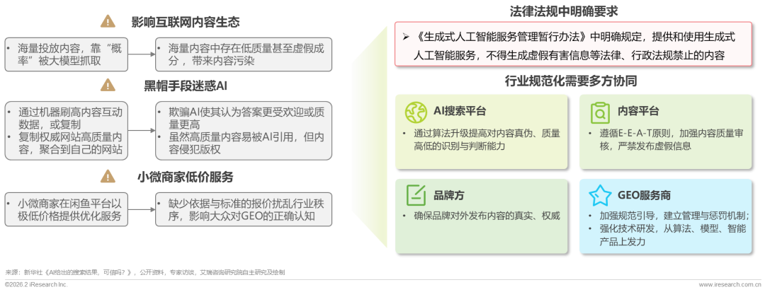GEO行业高速发展阶段,存在投机行为与违规操作,如海量投放低质量重复内容、黑帽手段迷惑AI 、极低价格提供所谓“优化”服务等。面对行业乱象,规范化管理需要政策约束与行业自律协同,合法合规运营需要各方参与者担起责任与义务。2026年2月3日,中国人工智能产业发展联盟AIIA发起《人工智能安全承诺:生成式引擎优化(GEO)专项》,多家GEO行业相关企业签署承诺,为GEO规范化、可信化发展梳理标杆。