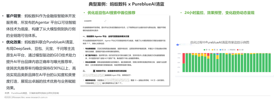 PureblueAI清蓝服务金融科技企业,通过布局多款主流原生AI 平台,依托自研模型驱动的GEO技术,将品牌内容优先推荐率稳定保持在90% 以上,高效提升新品牌认知度与美誉度,技术与业务赋能效果突出。