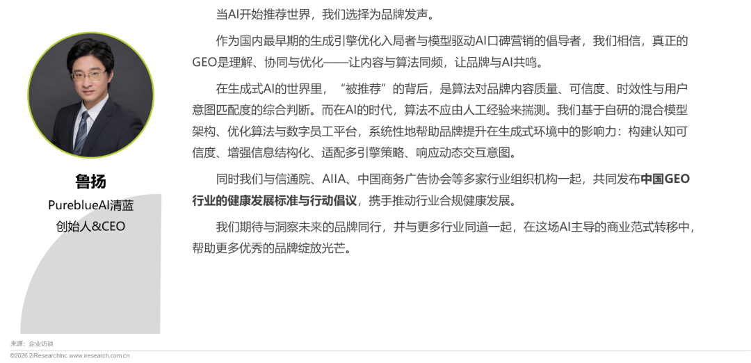 PureblueAI清蓝是一家专注于AI口碑营销服务的人工智能公司。创始团队成员毕业于清华大学、中科院等高校,曾任字节跳动、阿里巴巴等企业高管和技术专家。公司致力于成为品牌与AI之间的桥梁,基于自研的混合模型架构、优化算法与数字员工平台,通过先进的生成引擎优化(GEO)技术,助力企业提升品牌的AI推荐率和影响力。公司总部位于北京,目前已服务于汽车、金融、互联网科技、零售、消费、医疗等众多行业头部企业。获得来自英诺基金、蓝色光标、水木清华校友基金等知名机构投资。