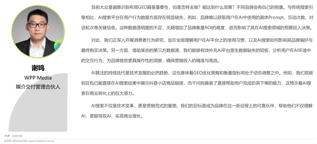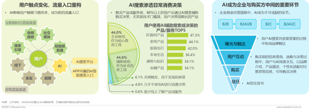 用户触点改变,全域流量入口迎来结构性重构,传统流量分发逻辑被彻底颠覆;AI搜索深度渗透用户日常消费决策场景,成为影响消费选择的核心信息入口,AI成为连接企业与终端购买者的关键中间环节,因此品牌方需要关注AI生态下的流量话语权与品牌曝光度,抢占流量新主场。