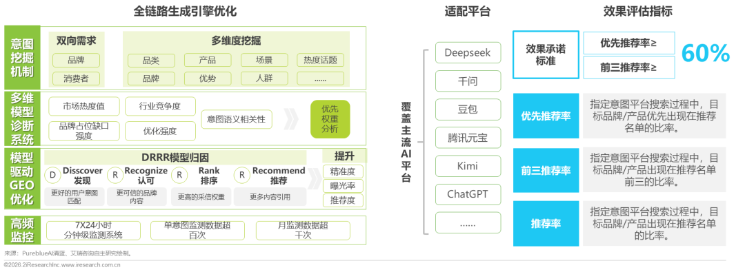 量化差距、洞察排名与口碑,全面评估品牌在AI环境的竞争格局、全局表现与影响力;衡量关键业务流程效率与投入产出比;精准优化,发现哪些文章、在哪个平台、以什么形式发布最容易被AI引用。