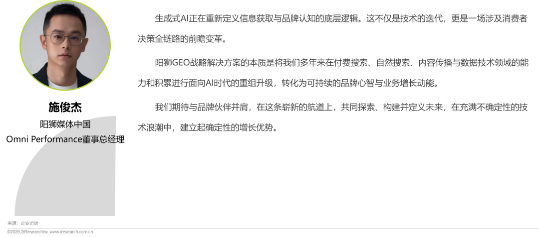 随着AI搜索渗透率提升,品牌方逐渐领悟到AI可见性与GEO优化的必要性,主要表现为营销预算的结构转移,如传统搜索引擎SEO、PR/舆情管理等品牌营销部分预算转移到GEO优化中,形成存量市场的结构性转移;其次,企业为构建品牌知识库、网页优化、API对接等产生的技术服务支出带来部分市场增量。