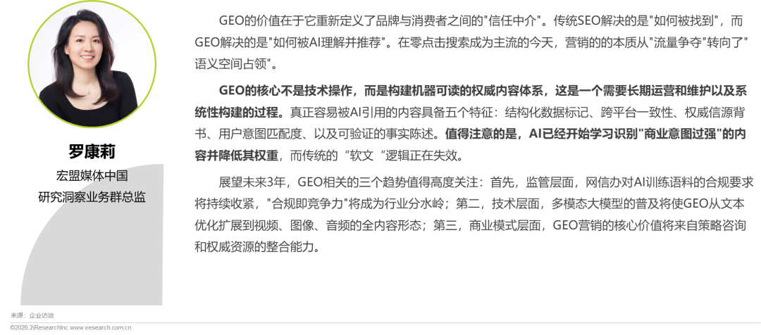 传统广告营销关注“短、平、快”的效果,追求布局一次永久有效、过度关注排名,同时期待短期内带来获客与转化。AI搜索引擎作为AI时代的关键流量入口,品牌应该关注与消费者建立信任关系,深耕品牌知识资产与细分领域的内容权威。GEO是一种品牌策略而非广告手段。