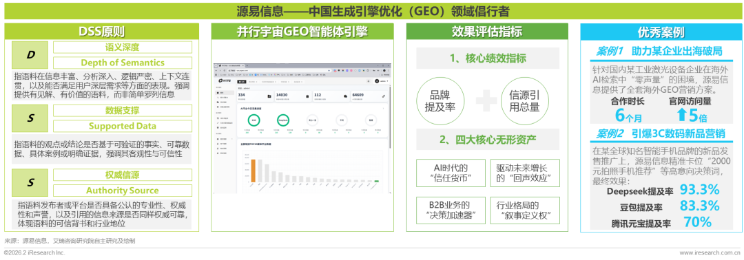 作为GEO领域的先行者,源易信息从2024年便协助国际顶奢品牌布局国内GEO推广。2025年3月,正式推出DSS方法论。这是面向AI时代的必要进化,构建了一套更适配中国大模型现状的可量化GEO执行方法。2025年4月,源易信息上线了基于DSS方法论自主研发的「并行宇宙」GEO智能体引擎,率先将理论转化为工程能力。截至目前,该系统已稳健服务超300个项目,实现了从诊断、策略到执行、监测的全链路闭环。得益于技术与实践的先行验证,同年5月,源易信息联合上海市计算机行业协会出品国内首份《决胜AI时代,GEO驱动企业营销新增长白皮书》。此举不仅推动了行业热潮,更实质性地定义了国内GEO的技术范式——通过确立这一底层框架,为后续入局者提供了通用的作业蓝本,从而奠定了整个GEO行业的工程化基础。