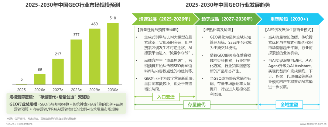 随着AI行业发展,企业GEO投入从试验性预算转为主要营销战略之一,预计2030年国内GEO市场规模超500亿。