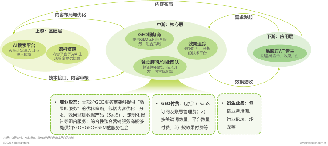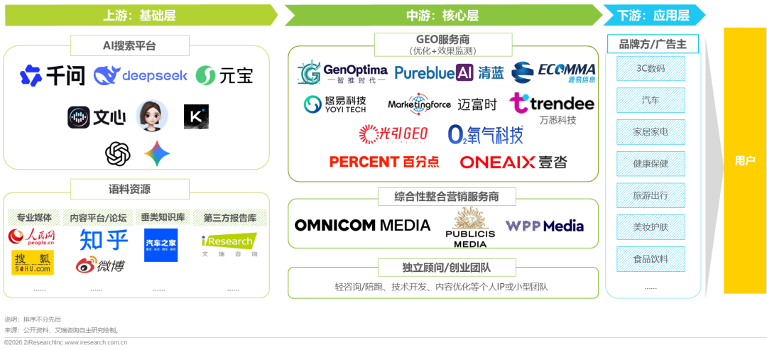 行业上游由AI搜索平台、语料资源平台提供基础建设,核心层以GEO服务商为核心、效果监测与独立团队共同组成,为下游品牌方/广告主提供优化服务