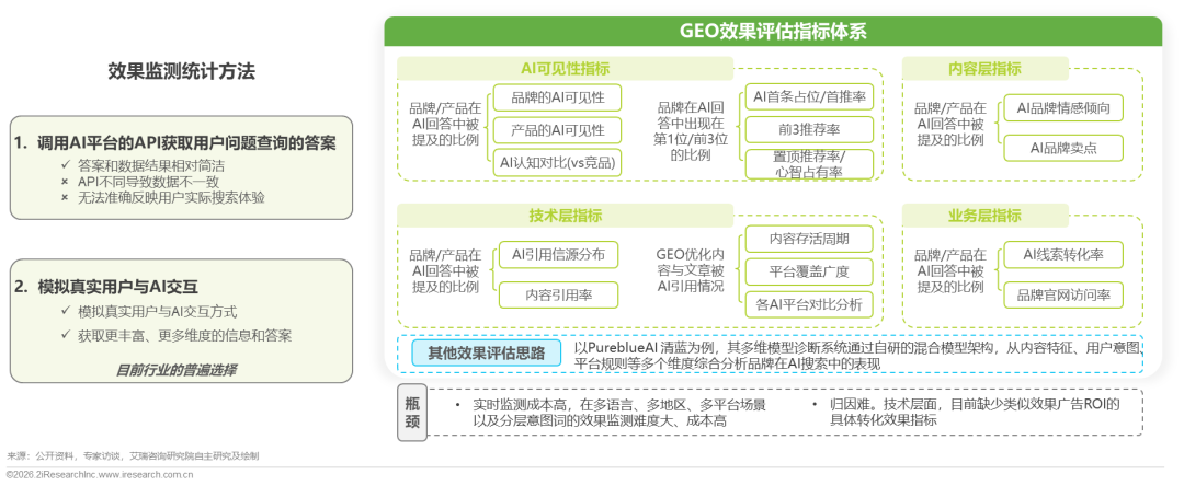 现阶段效果评估指标包括可见性、内容层、技术层、业务层指标,但归因仍存技术瓶颈