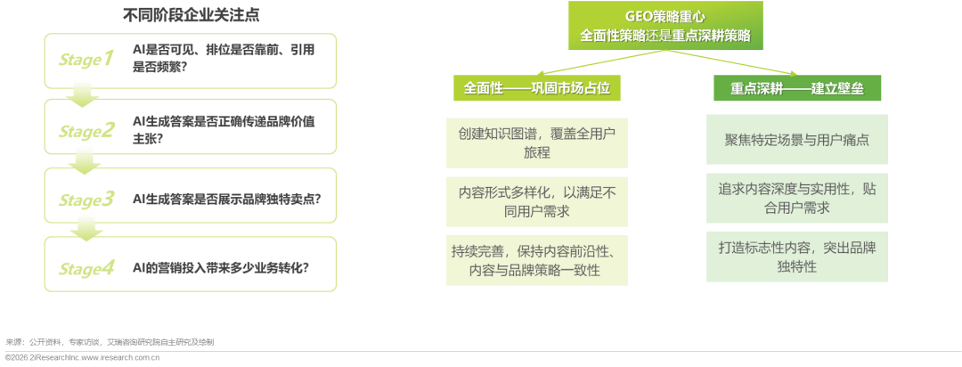 未来AI生态的营销竞争将从AI可见性的静态占位变为动态竞争,随着企业对GEO的认知深入,其关注点从可见性专项品牌价值的传递与品牌独特性卖点的呈现。当品牌竞争加剧、营销预算有限的内外交困局面时,企业可能面临全面优化还是重点深耕的选择题,因此GEO策略需要从巩固市场地位、建立竞争壁垒两方面优化。