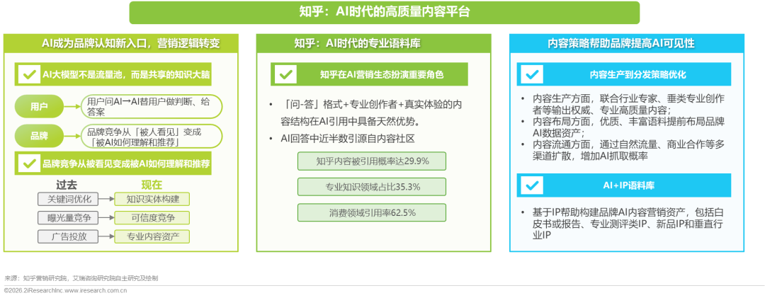 知乎作为高质量内容社区,在AI营销生态中扮演关键角色。知乎的内容结构与内容广度使其在AI信源引用率方面具备优势,同时平台聚集的高质量用户推动了内容生产、讨论、转化效率。知乎内容生产与布局具有专业性、高质量,内容传播影响力广泛,品牌需要重视知乎的语料价值。
