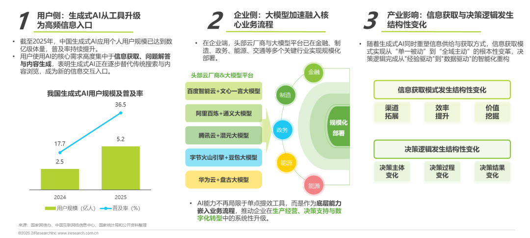 中国AI行业已进入以生成式AI为核心的规模化应用阶段,AI正从效率工具演进为用户高频的信息获取与决策入口
