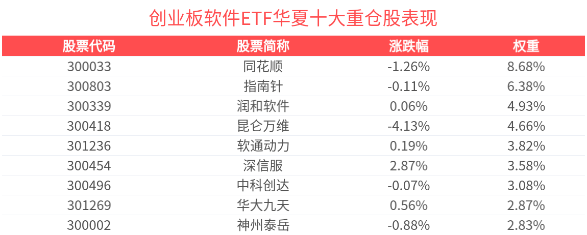 创业板软件ETF华夏紧密跟踪创业板软件指数,截至2026年1月30日,指数前十大权重股分别为同花顺、润泽科技、昆仑万维、指南针、深信服、润和软件、网宿科技、软通动力、中科创达、汉得信息,前十大权重股合计占比48.61%。(以上所列股票仅为指数成份股,无特定推荐之意)