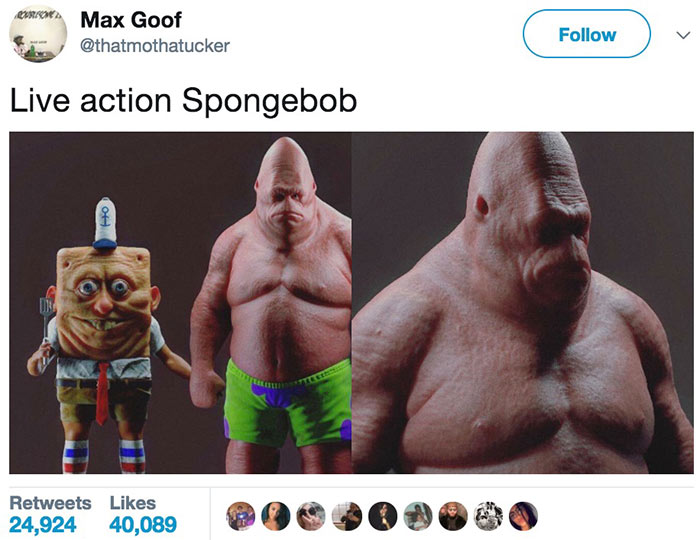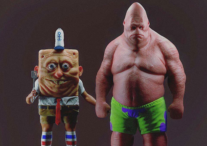 经久不衰的动画片《海绵宝宝》一直是网友们的心头好,但是你想象过现实版的海绵宝宝和派大星是什么样吗?有人就根据动画片设计了他们“真实”的样子,动画片秒变惊悚片。