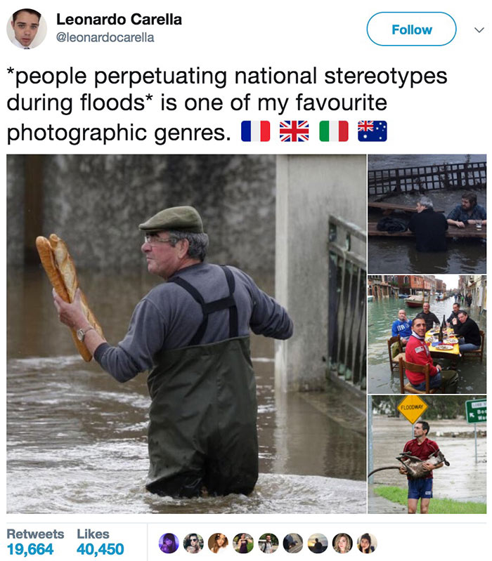 只有在最危险的时刻才能看出一个人真正的性格,有网友总结了各国人民在发洪水时的举动,不得不说,有时候刻板印象还是很有道理的。