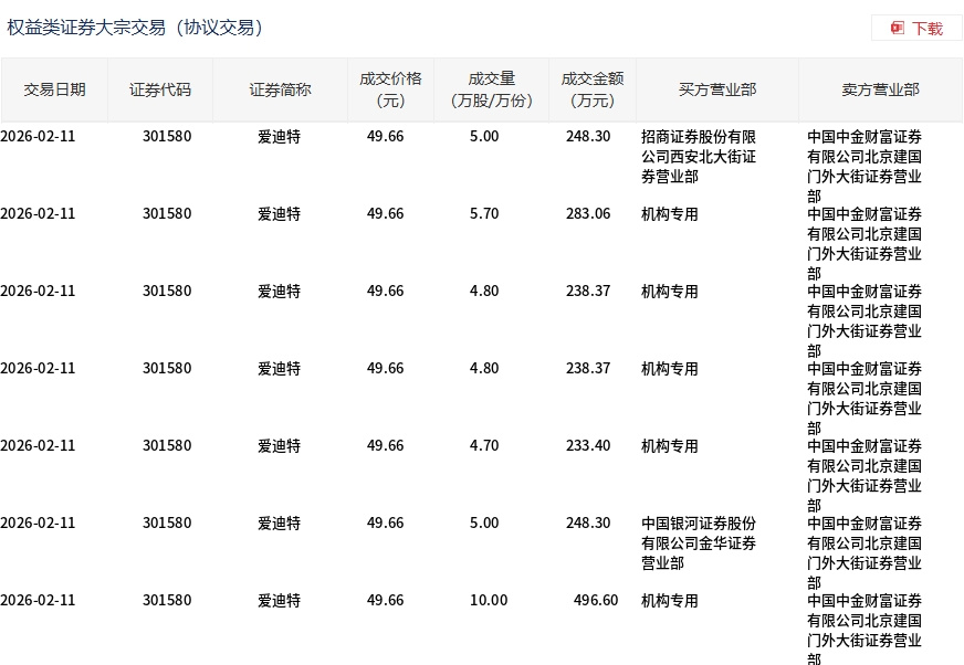 2月11日,爱迪特大宗交易成交40万股,成交额1986.4万元,占当日总成交额的7.34%,成交价49.66元,较市场收盘价55.18元折价10%。