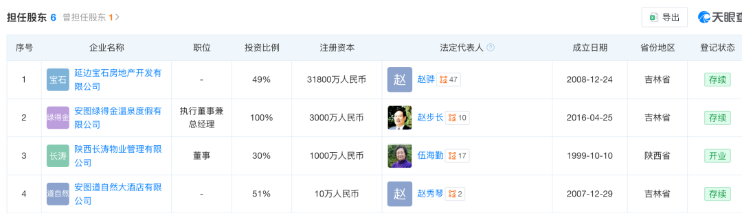 如今,延边宝石已与赵氏家族深度绑定:赵步长直接持股49%,剩余51%由吉林省安图长涛矿泉饮品有限公司持有,后者94.8%股份由赵步长的长子赵涛的岳母王秀珍持有,1%由长女赵骅(步长制药总裁助理)持有。