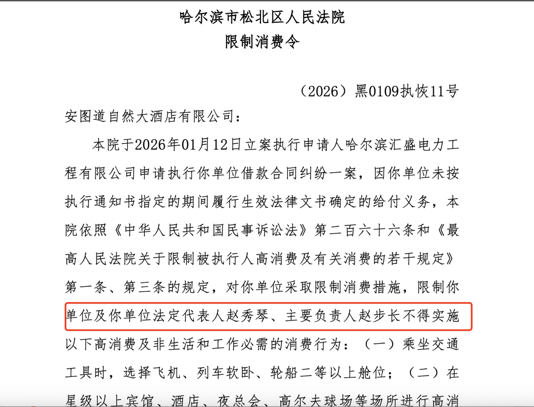 据中国执行信息公开网的信息,2026年1月,因未按执行通知书指定的期间履行生效法律文书确定的给付义务,哈尔滨市松北区人民法院日前对安图道自然大酒店有限公司(下称:“安图道自然大酒店”)采取限制消费措施,对公司法定代表人赵秀琴、主要负责人赵步长限制实施高消费及非生活和工作必需的消费行为。根据公开资料显示,赵步长现年84岁。
