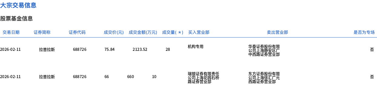 2月11日,拉普拉斯大宗交易成交38万股,成交额2783.52万元,占当日总成交额的1.65%,成交均价73.25元,较市场收盘价76.99元折价4.86%,其中最高成交价75.84元,最低成交价66元。